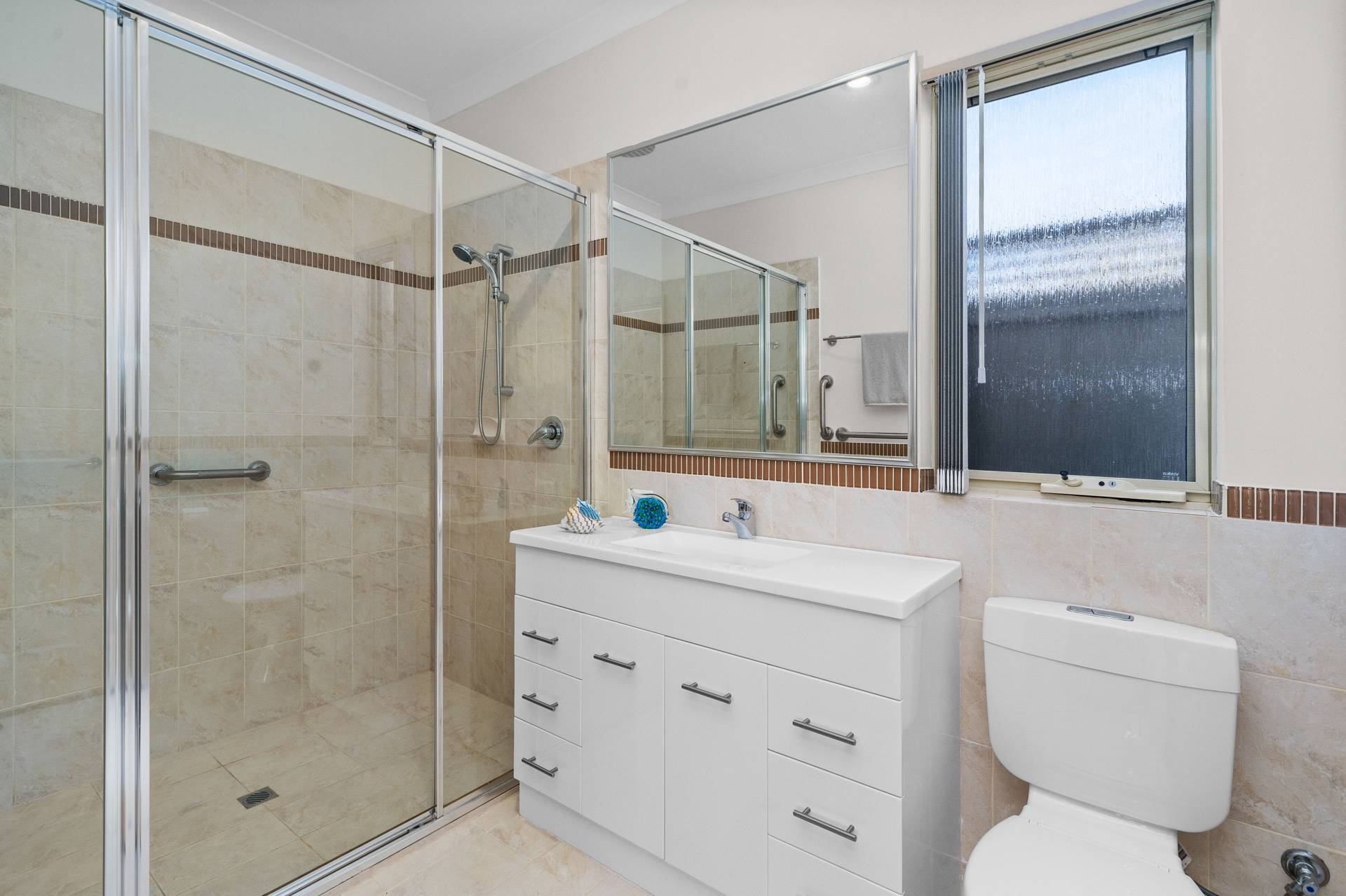 * Ensuite: Featuring a wide vanity, glass framed shower, and WC.