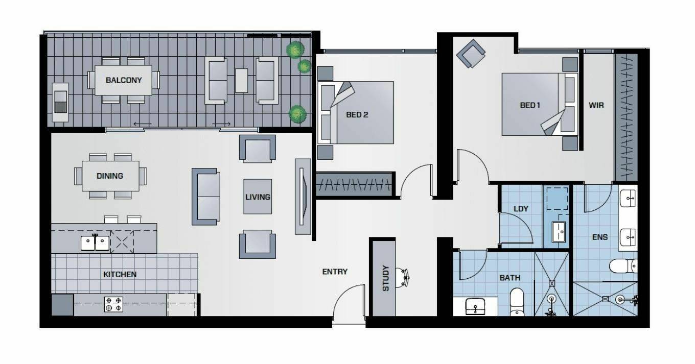 This 2nd floor apartment features an unusually large 94sqm of space offering a two bedroom, two bathroom layout with separate laundry and study area, all providing a generous space in comparison to most other apartment designs.