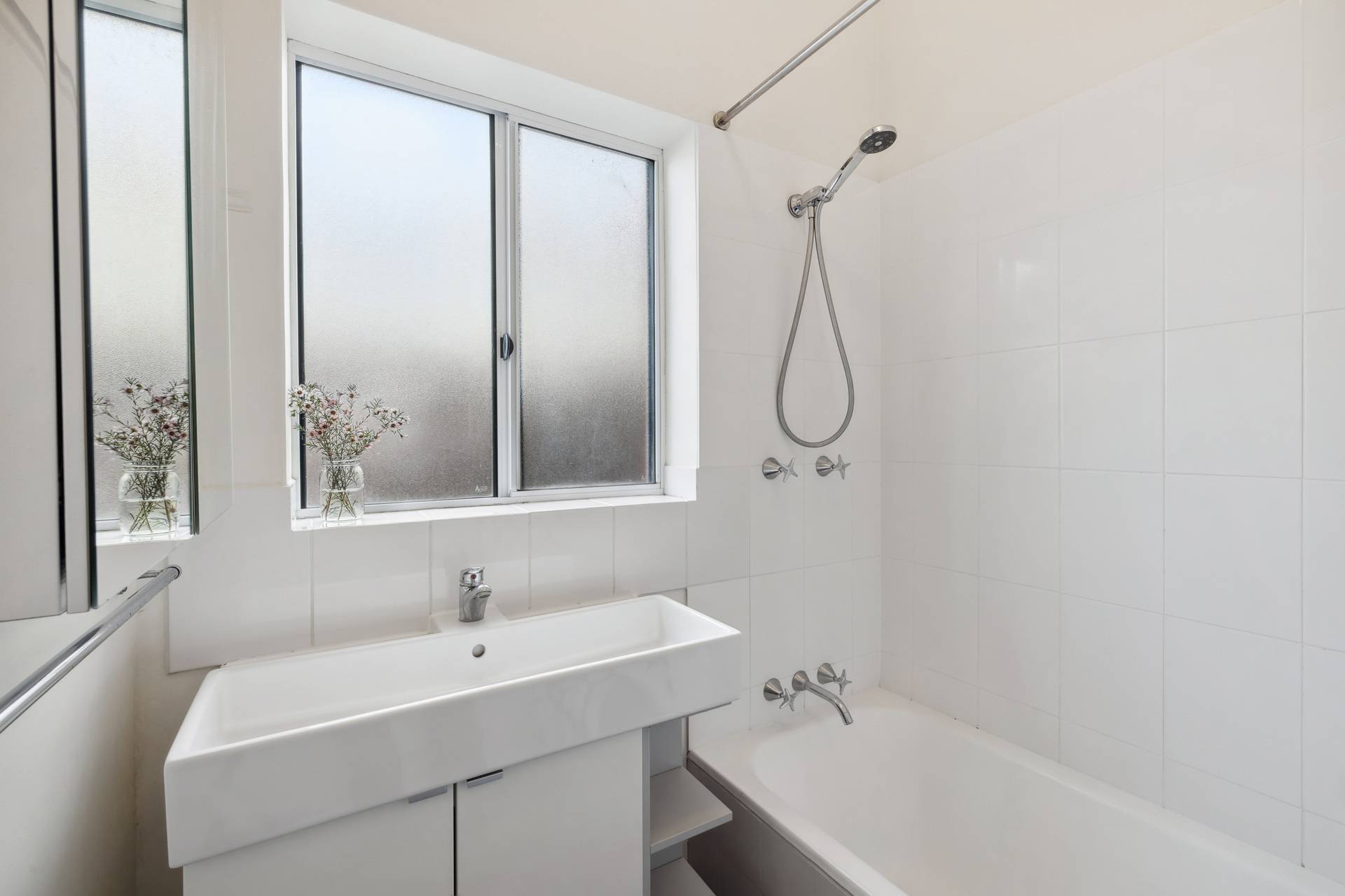 * Modern bathroom with vanity and shower over bath