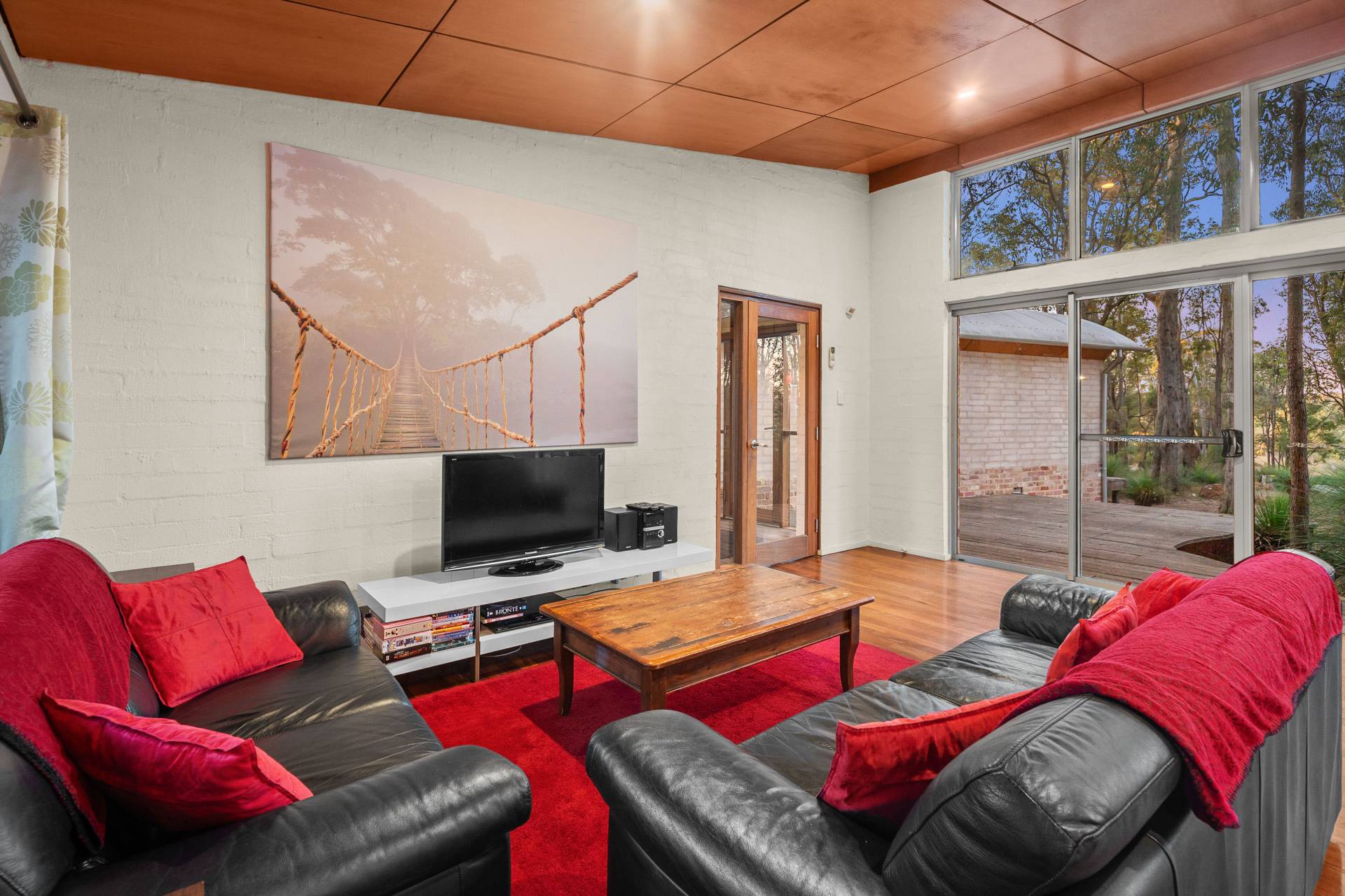 The home features four huge bedrooms, including a master suite with a full ensuite. The main bathroom is a luxurious retreat with a spa bath and elegant travertine marble tiling. The open-plan living area is highlighted by polished jarrah flooring, a deluxe kitchen, and a cosy wood-burning heater, all offering stunning views of the bush beyond.