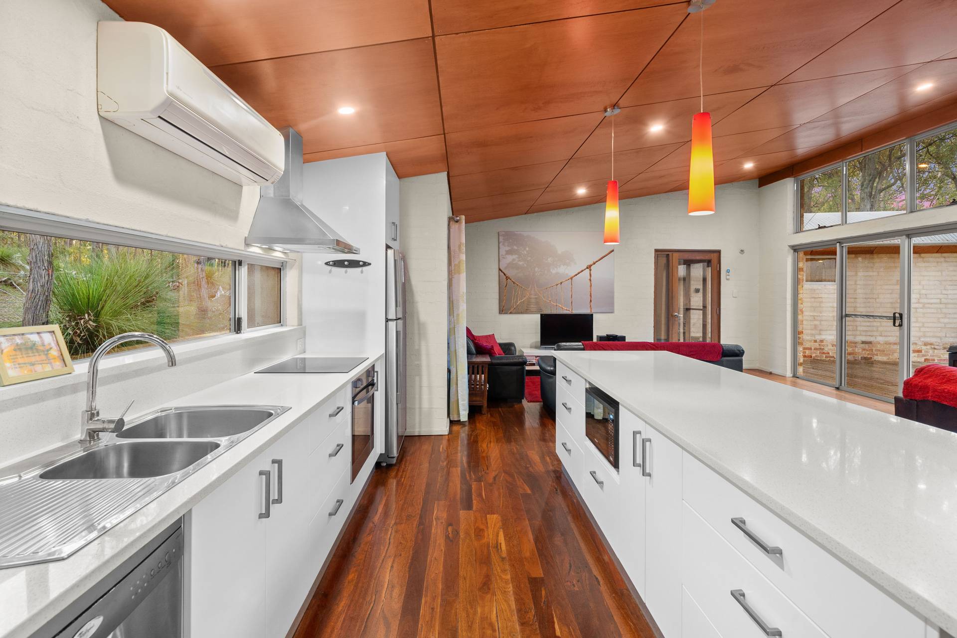 Thoughtfully designed with modern, earthy elements, this residence boasts skillion and barrel vaulted ceilings, quality finishes and a stunning solid jarrah deck that blends seamlessly with the surrounding native landscape.