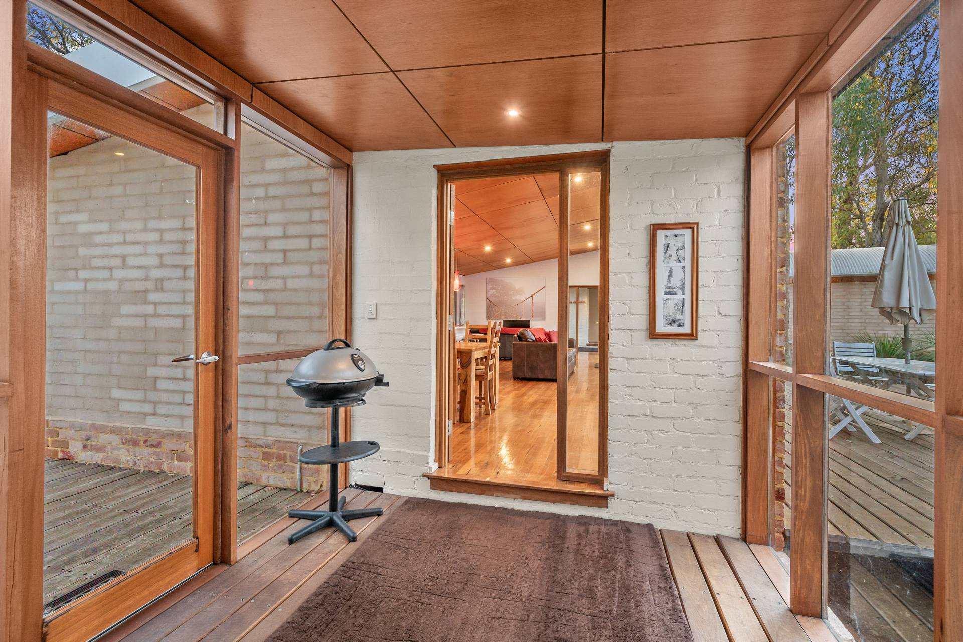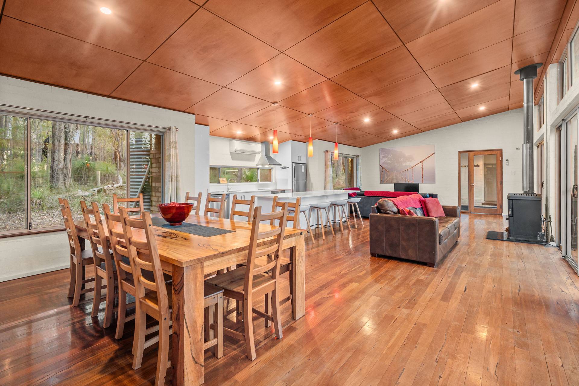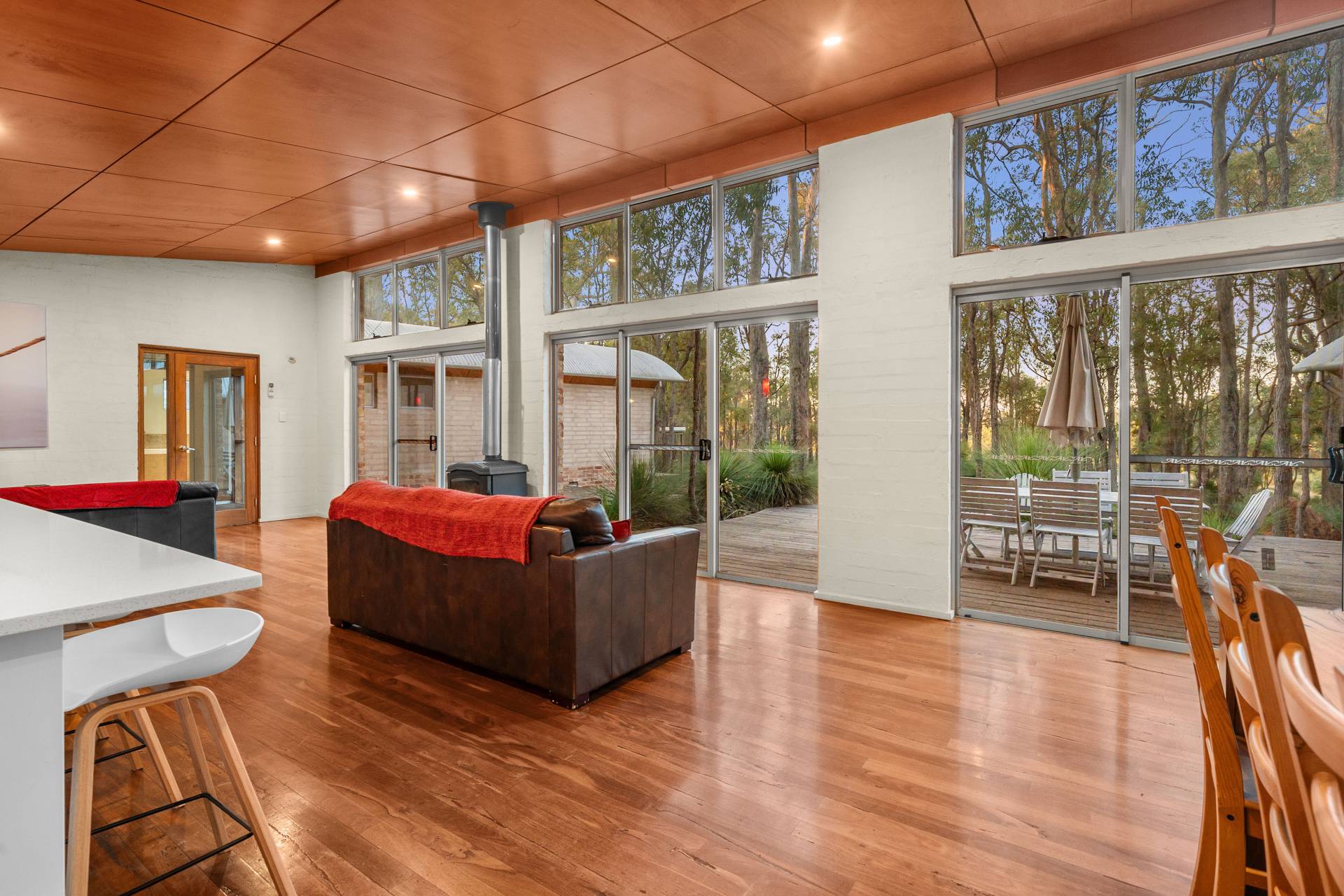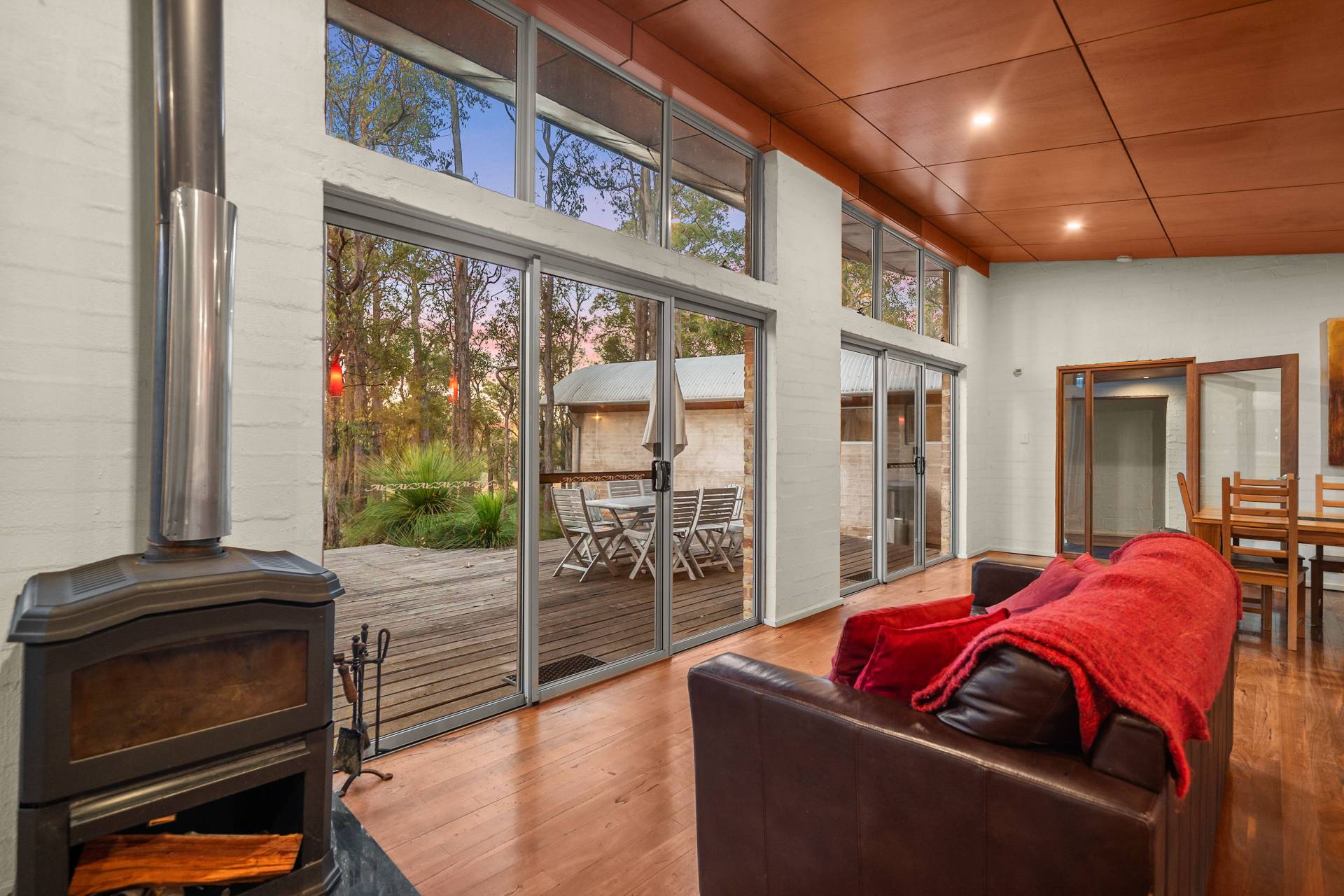 * Open-plan living area with polished jarrah flooring and a cosy wood burning heater