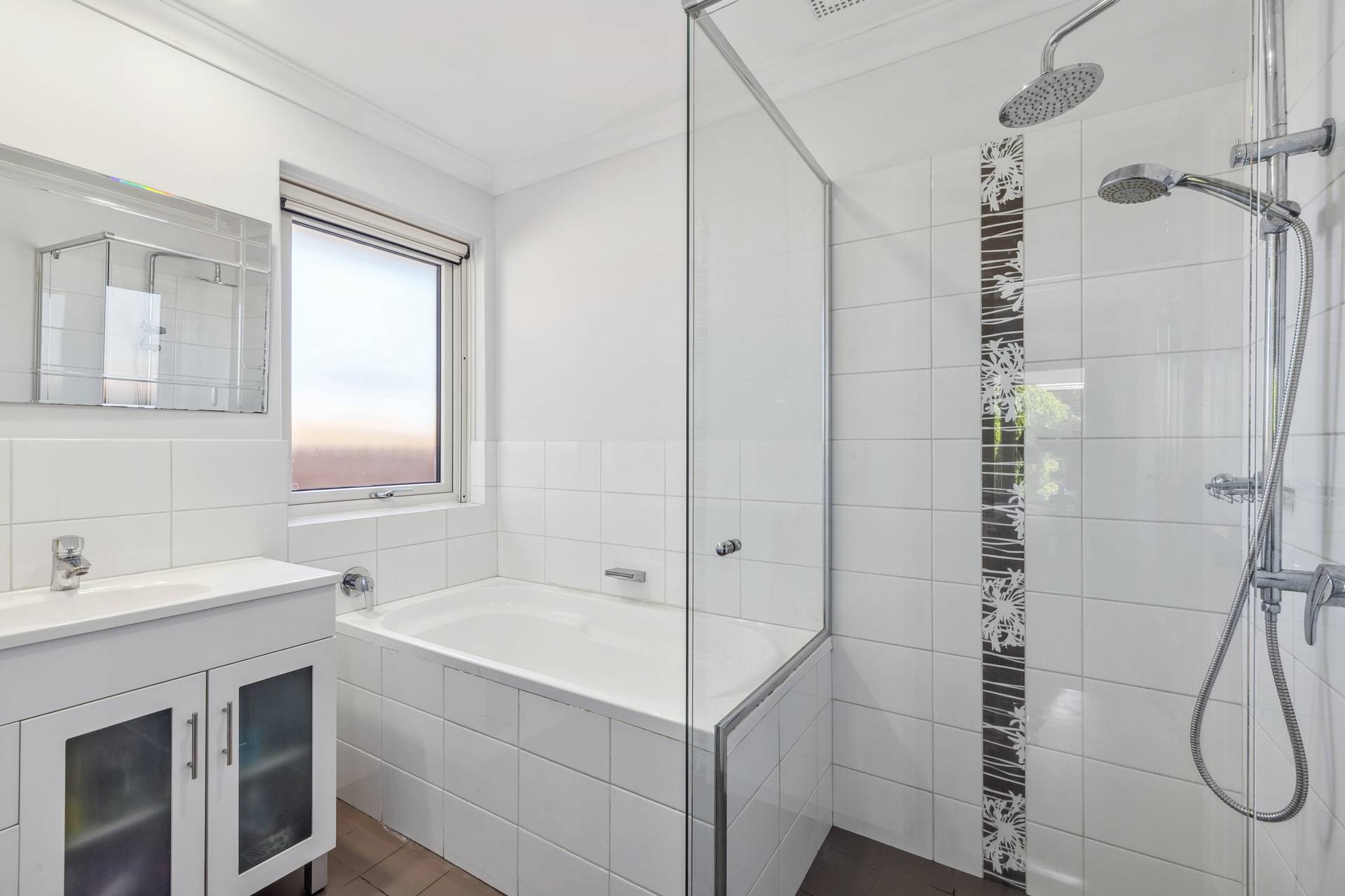 * Main bathroom with built in bath, shower and vanity