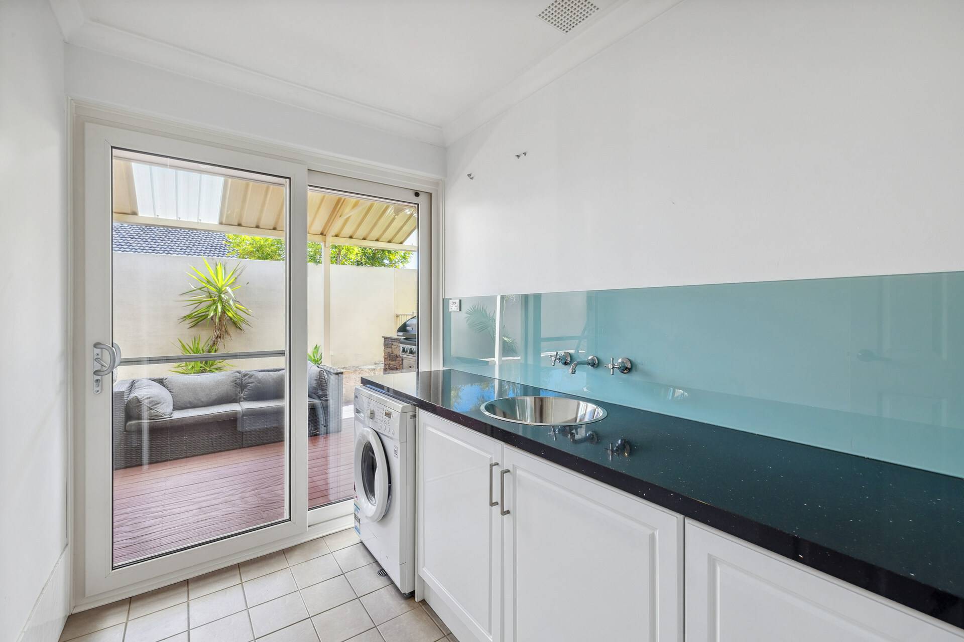 * Laundry with modern cabinetry & glass splashback
