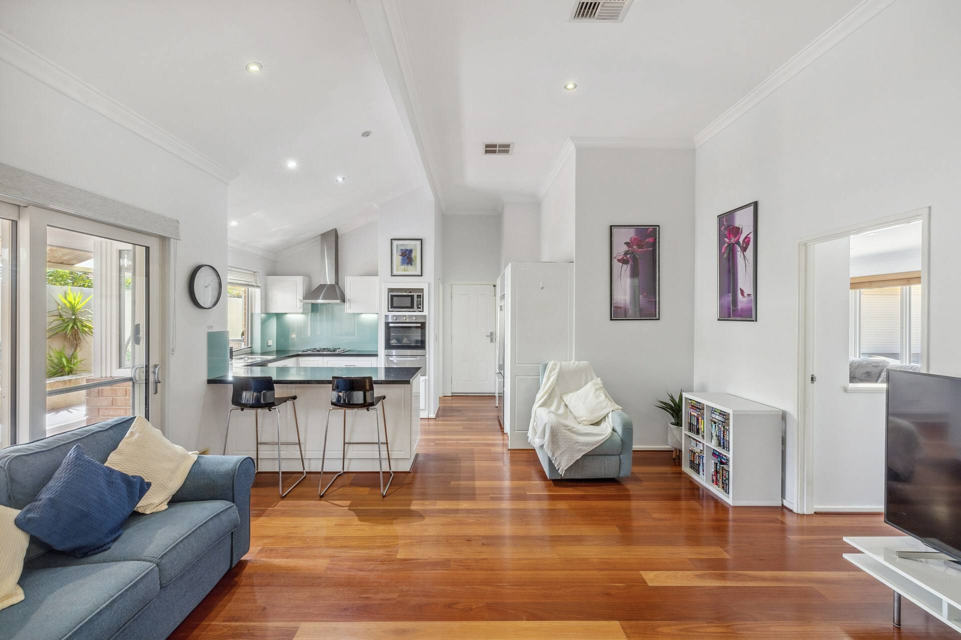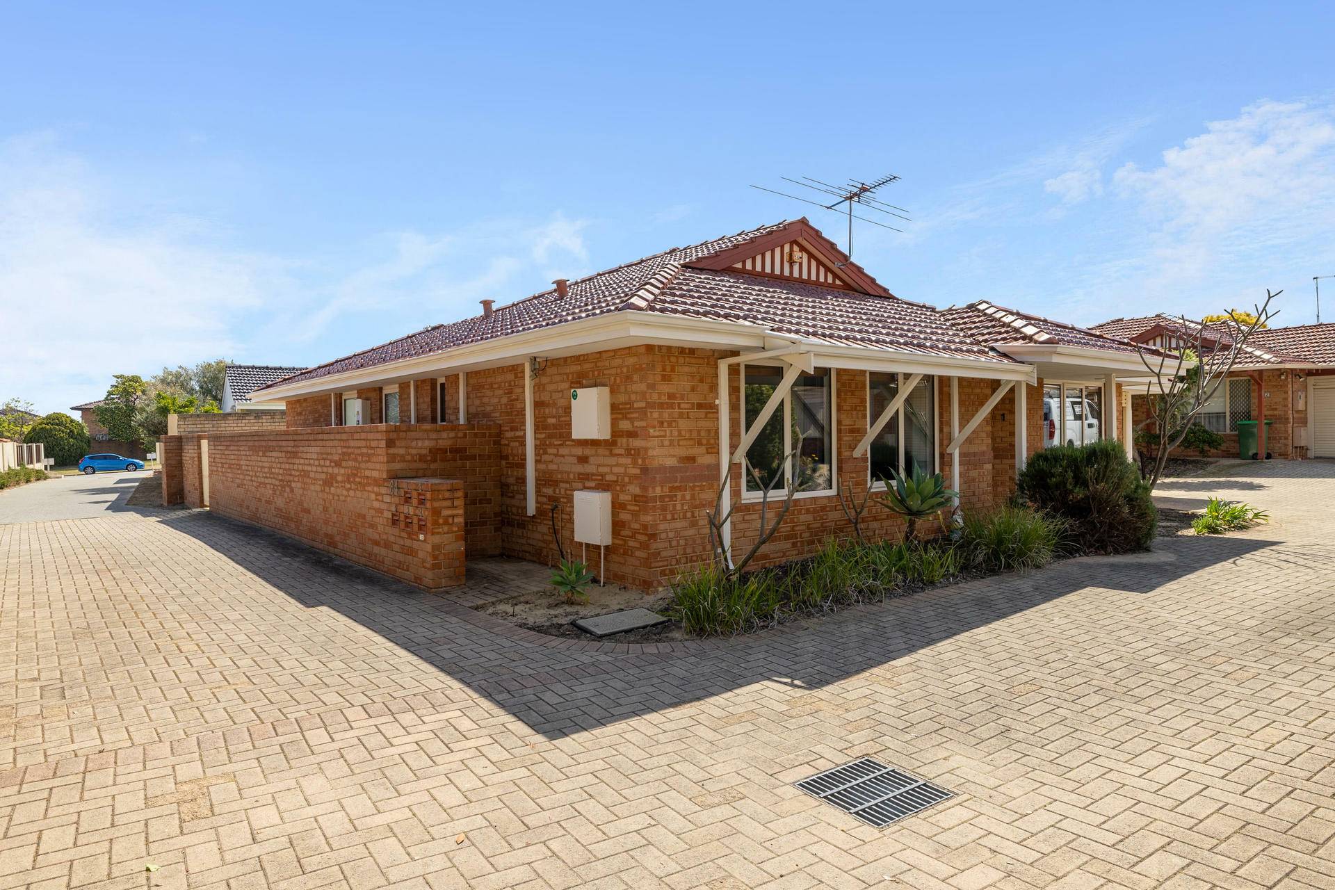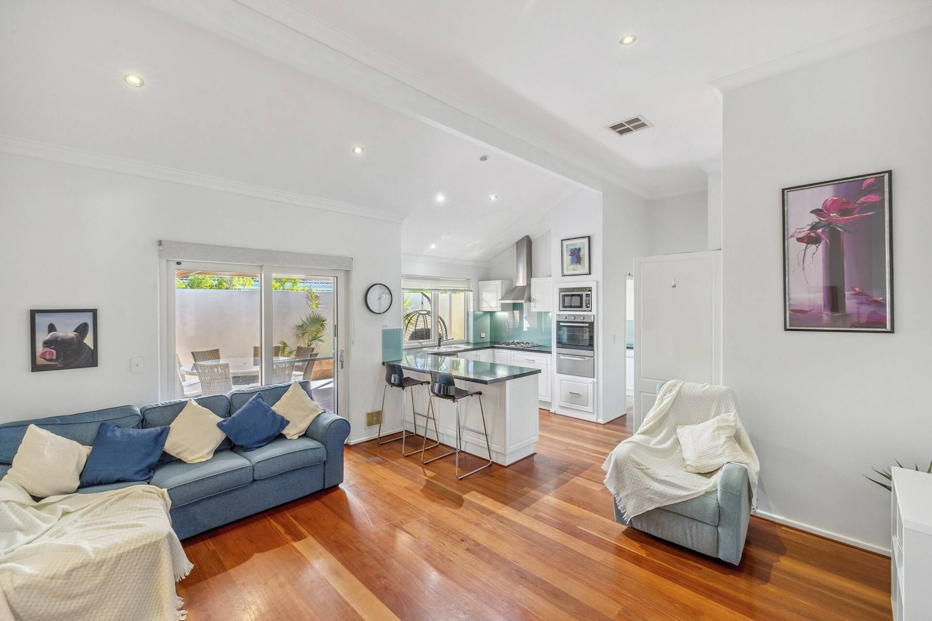 Tucked away in a quiet group of 4 properties, the home’s exposed brick façade creates a welcoming entrance. Step inside to discover solid wooden floors in the living areas, complemented by neutral tones that enhance the warm and inviting atmosphere. The separate lounge, positioned at the front of the home, offers a peaceful retreat to unwind.
