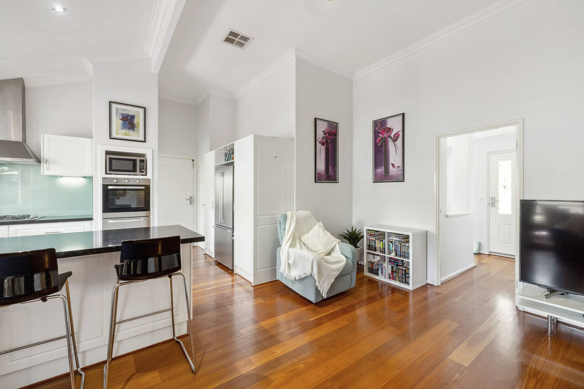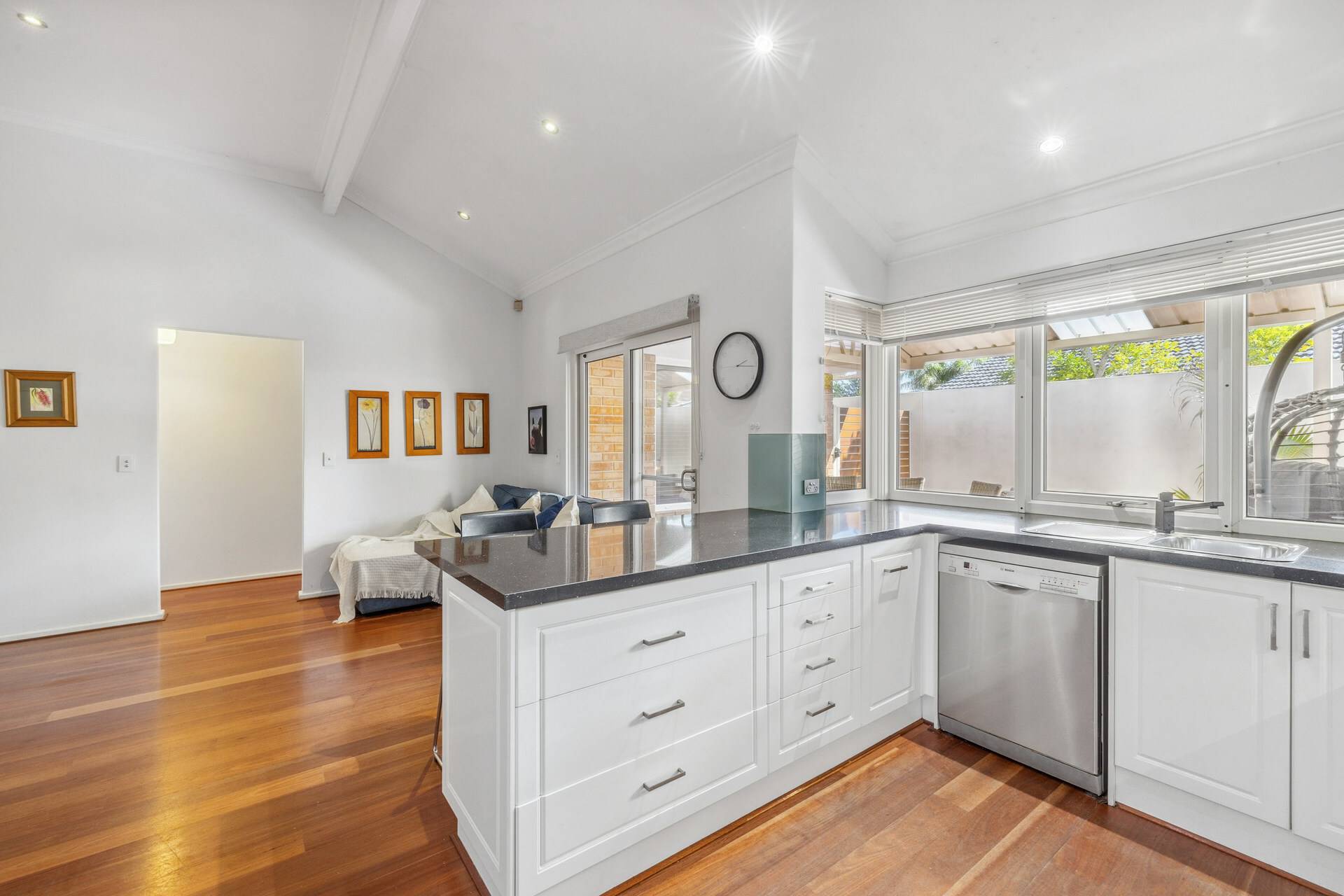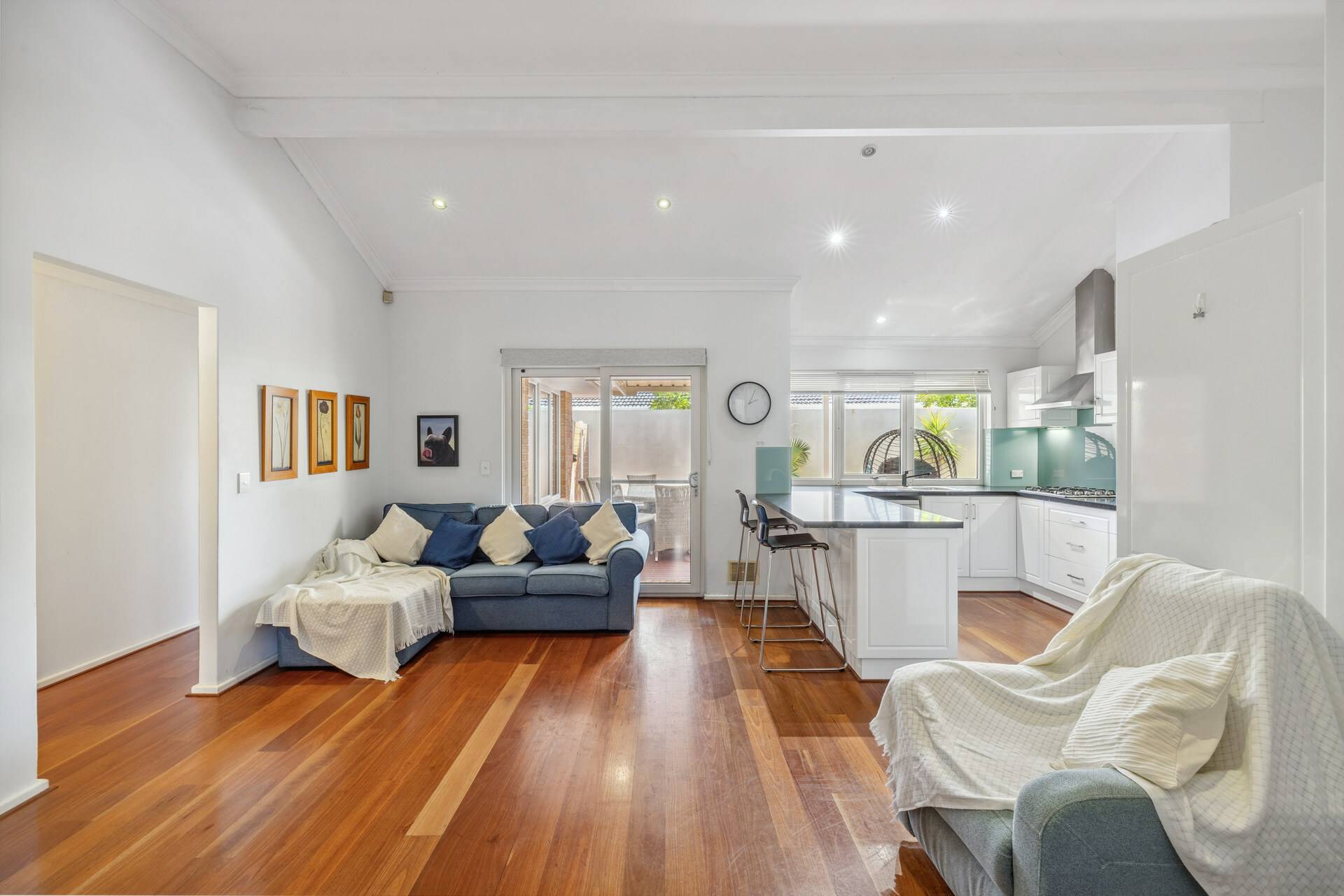 Tucked away in a quiet group of 4 properties, the home’s exposed brick façade creates a welcoming entrance. Step inside to discover solid wooden floors in the living areas, complemented by neutral tones that enhance the warm and inviting atmosphere. The separate lounge, positioned at the front of the home, offers a peaceful retreat to unwind.