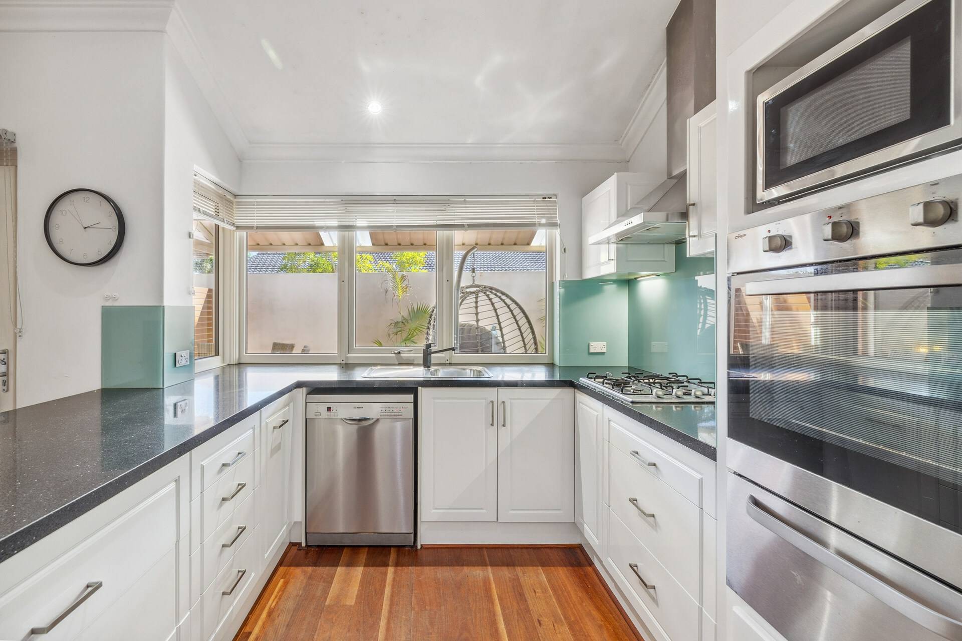 * Renovated kitchen with stone benchtop, modern appliances and splashback