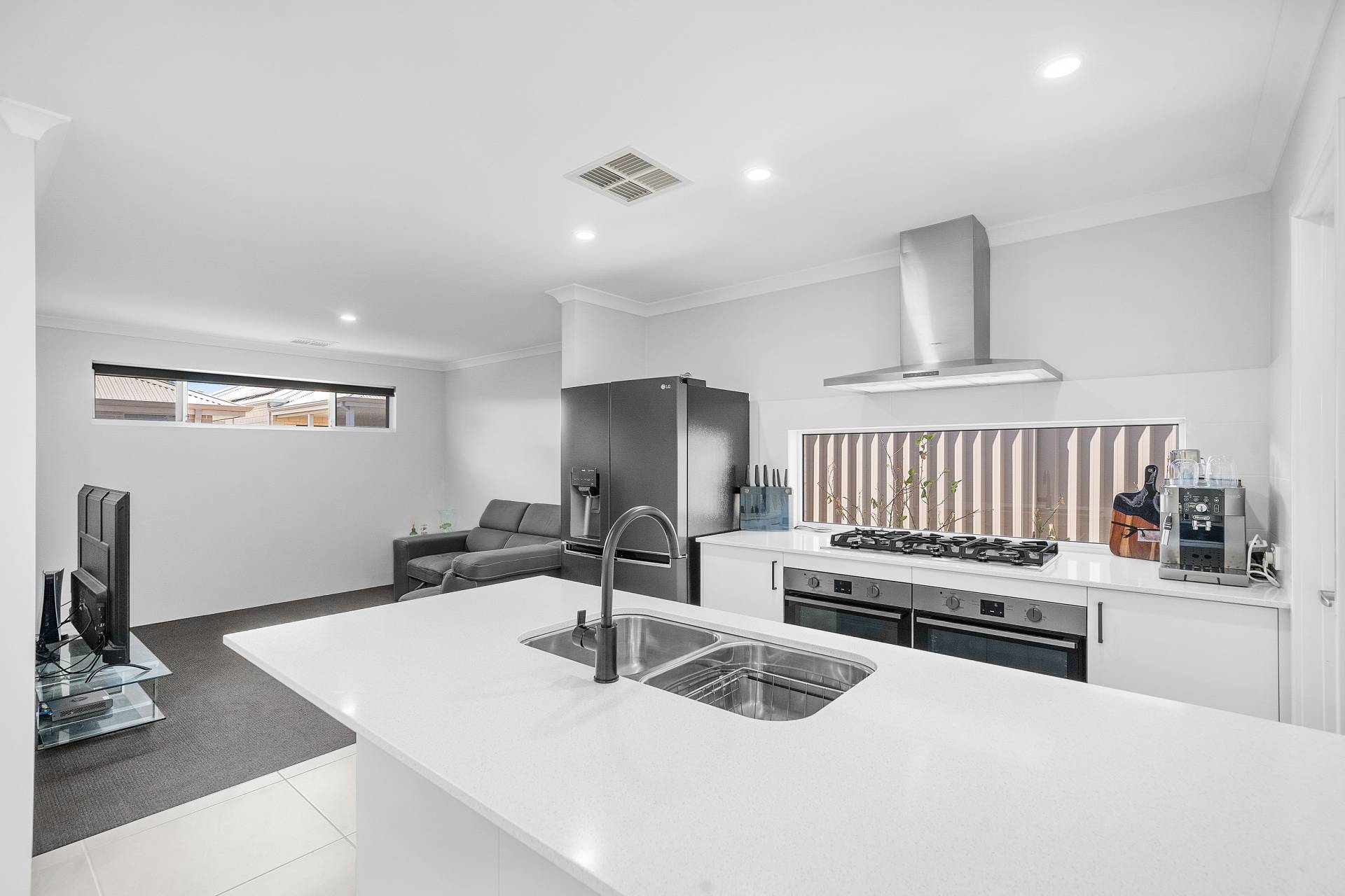 At the heart of the home the kitchen will delight the budding chef with stone benchtops, a walk in pantry and two under bench ovens as well as a 900mm wide gas cooktop.