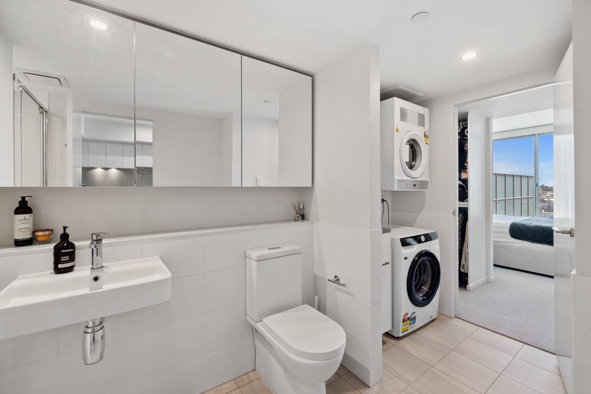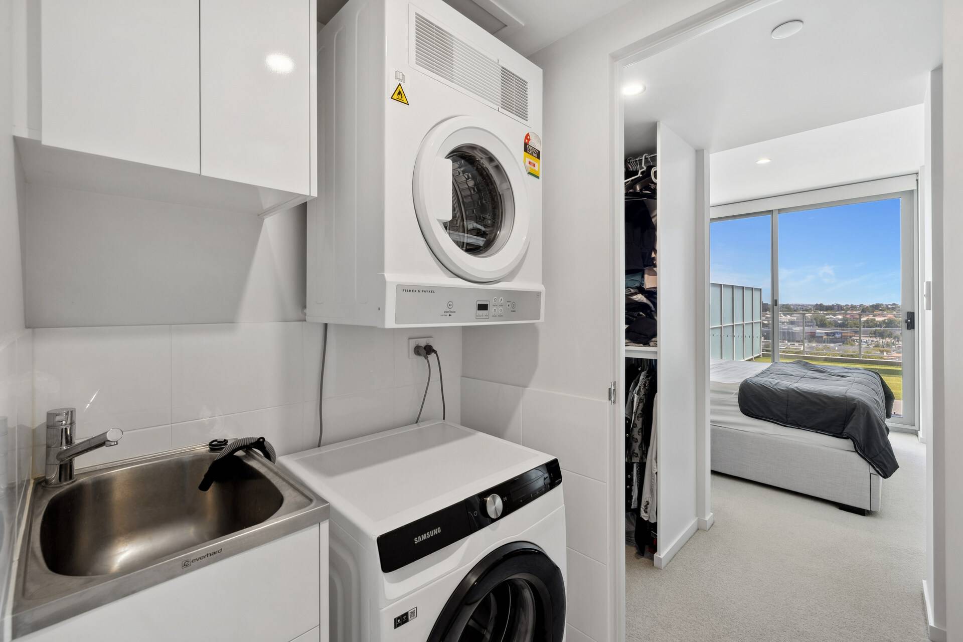 The bedroom features a luxurious his and hers walk in robe leading to a semi-ensuite with a concealed laundry for added convenience. Located on the 5th floor, this apartment offers panoramic views and a sense of elevated tranquility.