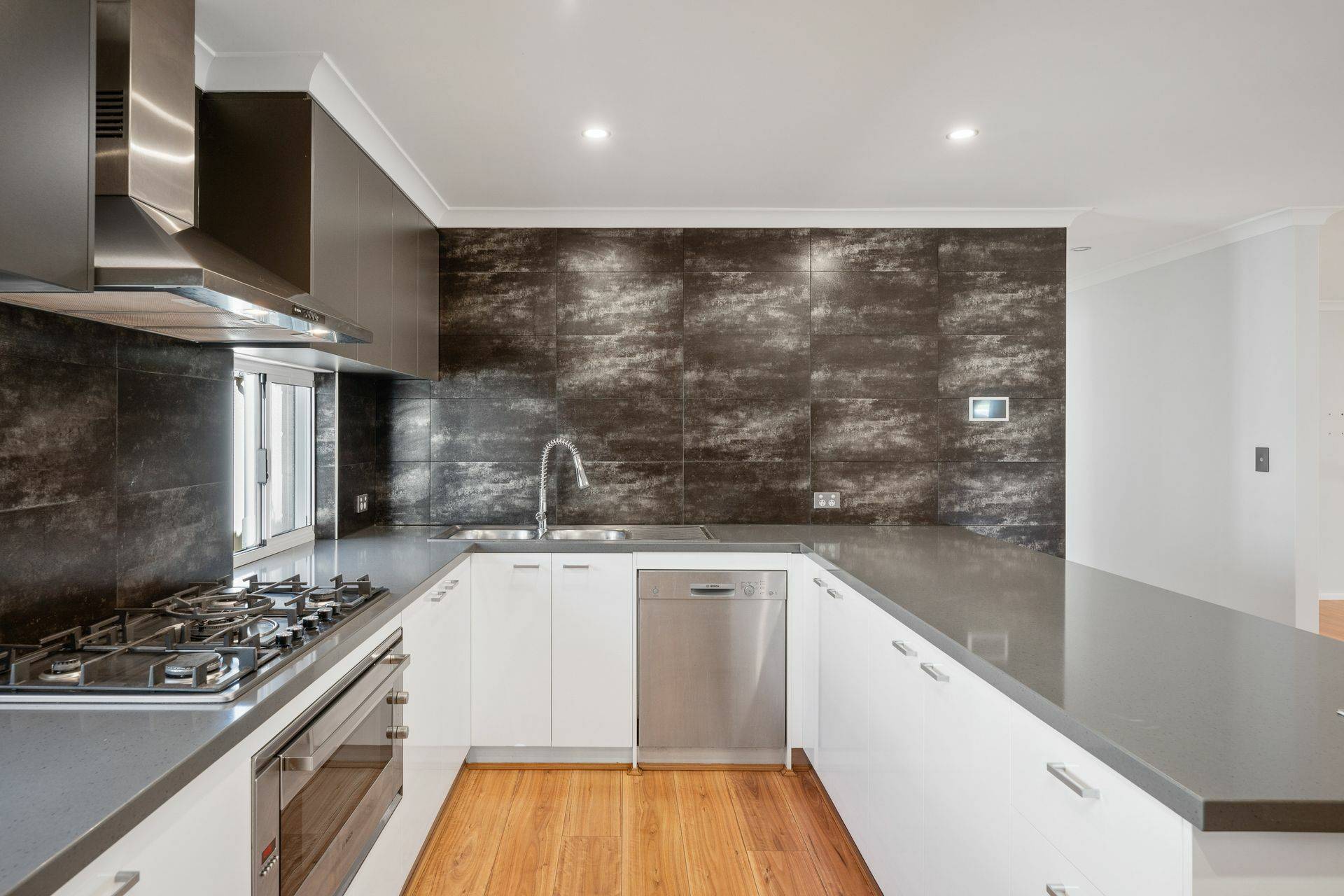 The gourmet kitchen is a central hub for entertaining, featuring state-of-the-art appliances, stone benchtops with lift-up power points, a breakfast bar, built-in pantry, double sink, gas cooktop, electric oven and ample storage.