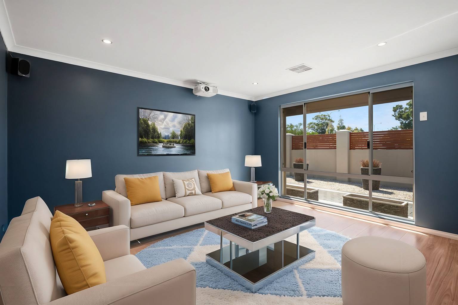Designed for effortless flow, the open-plan layout includes multiple living areas: a separate study/activity room, a home theatre (with projector and screen) and a bright, airy living and dining space.
