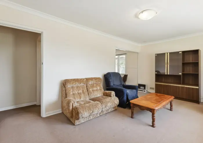 The home features a light filled lounge with split system air-conditioning, a functional kitchen/dining area with ample bench space and a free-standing gas stove .