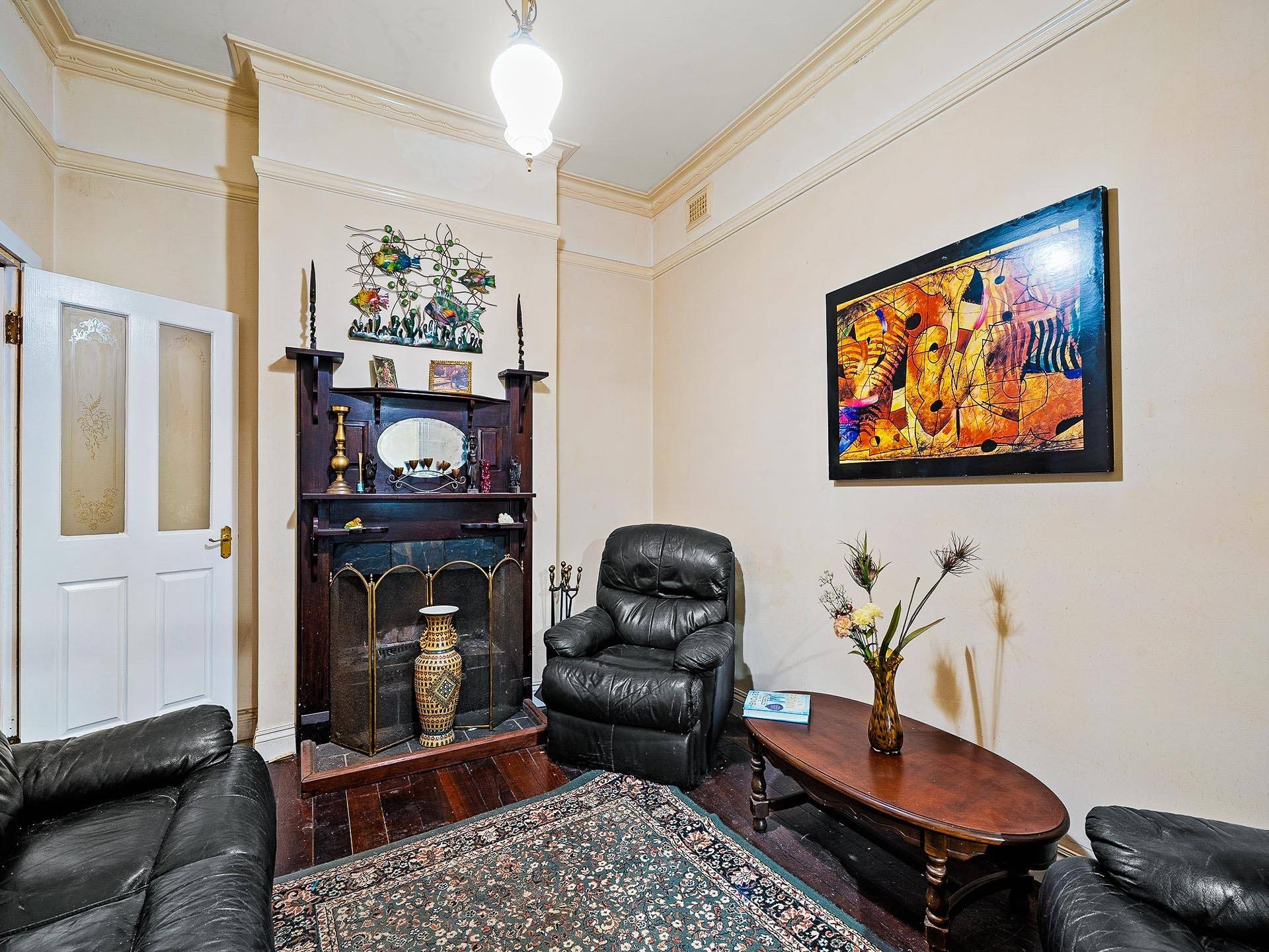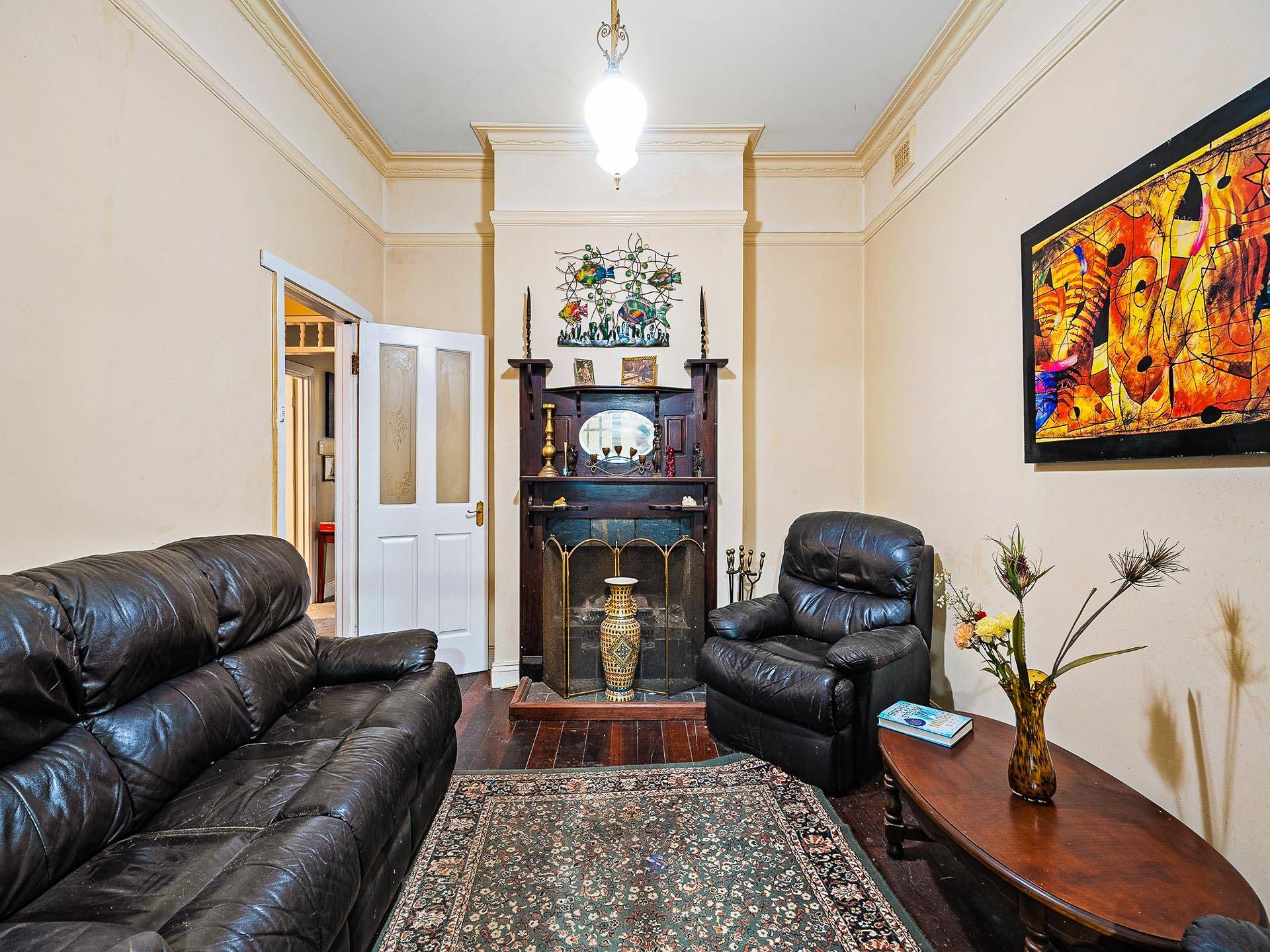 * Front lounge with Jarrah wood floor and feature fireplace
