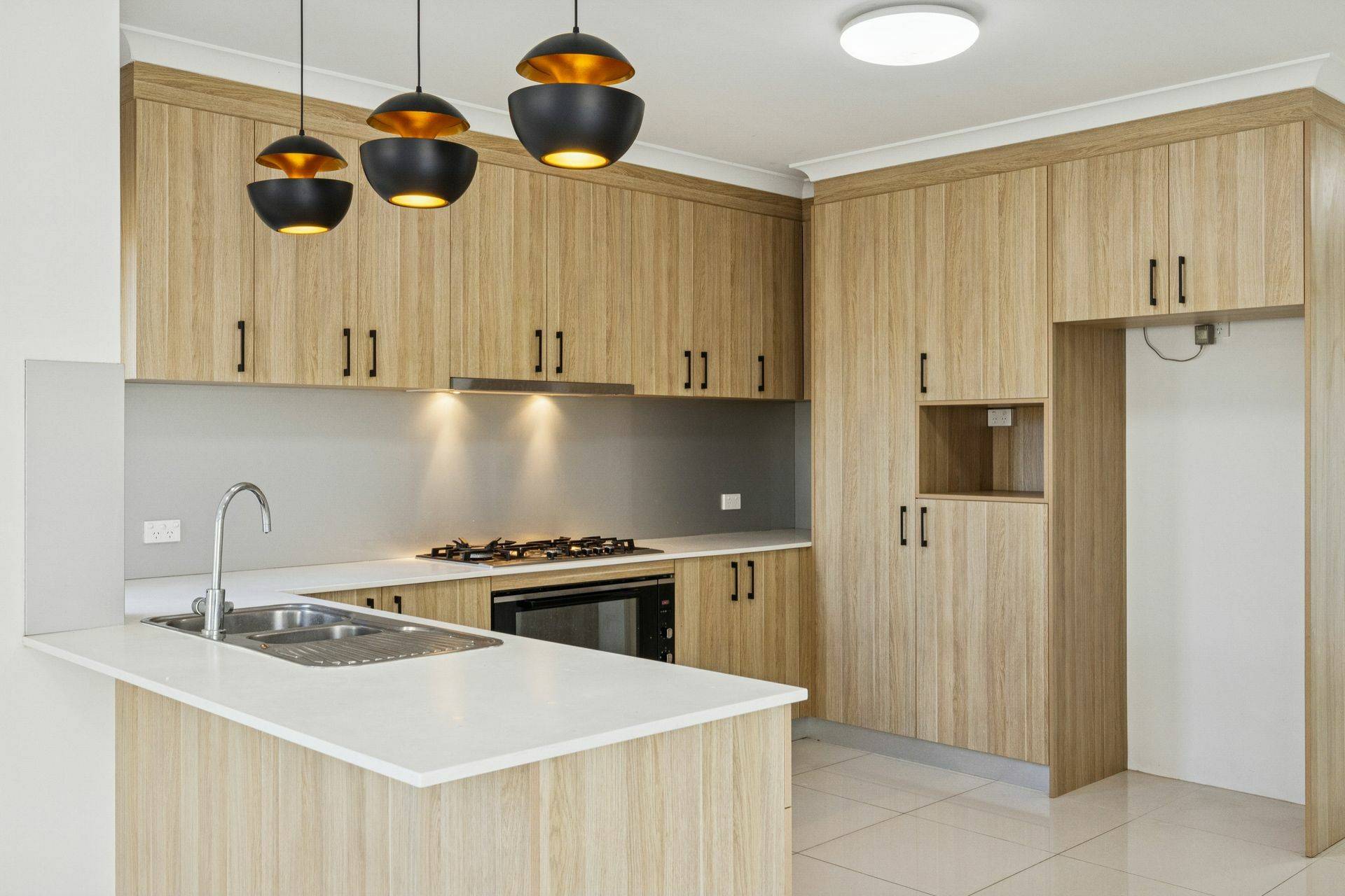 * Designer kitchen with stone benchtops, 900mm appliances & overhead cabinetry
