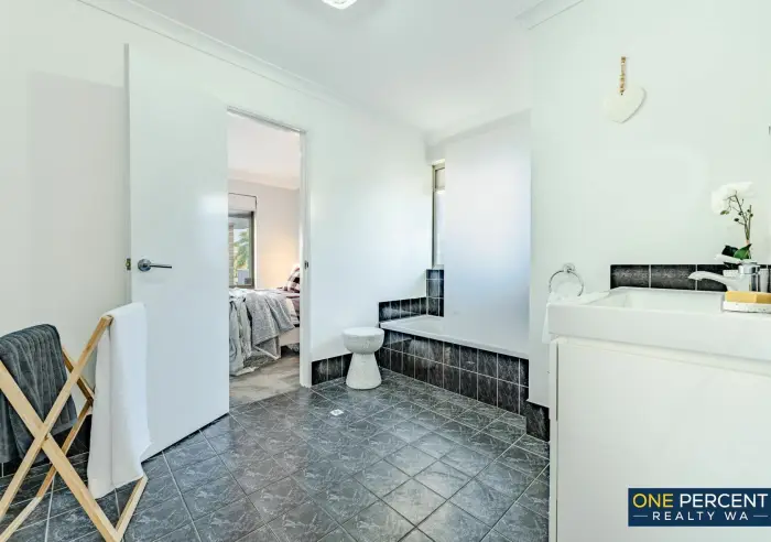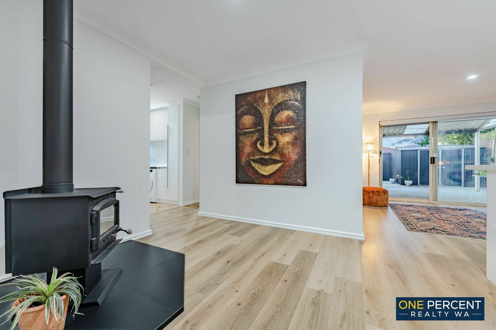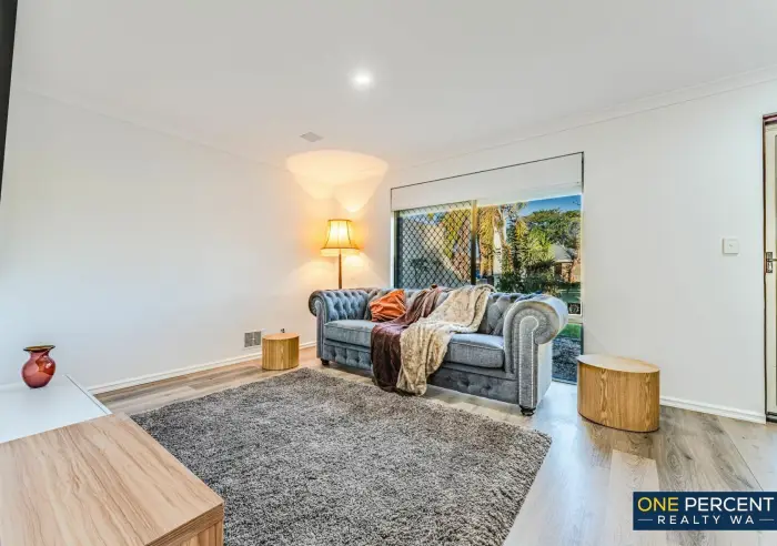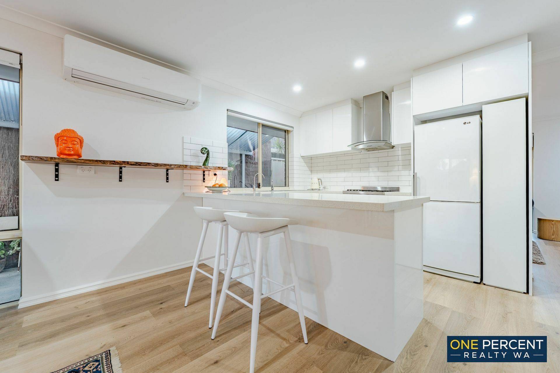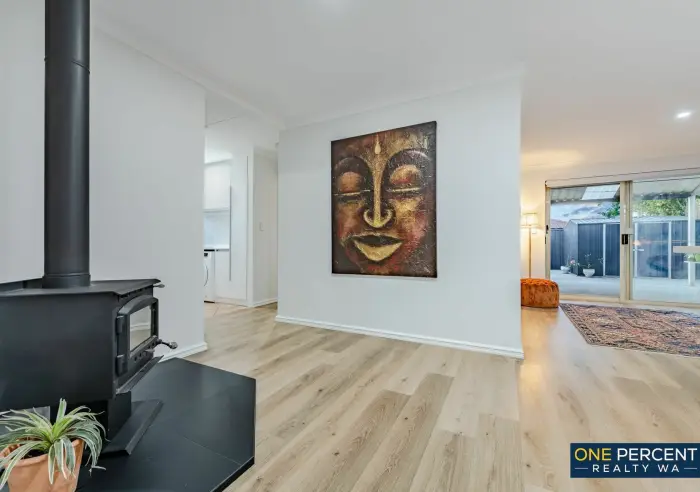 The thoughtfully redesigned open plan layout creates a welcoming and inviting atmosphere, anchored by a stunning kitchen featuring stone benchtops, gas cooking and striking marri wood shelving with natural edges. Opposite the kitchen, the custom designed laundry continues the premium feel with matching stone tops, ample cabinetry, pull out hamper, broom cupboard and generous linen storage.