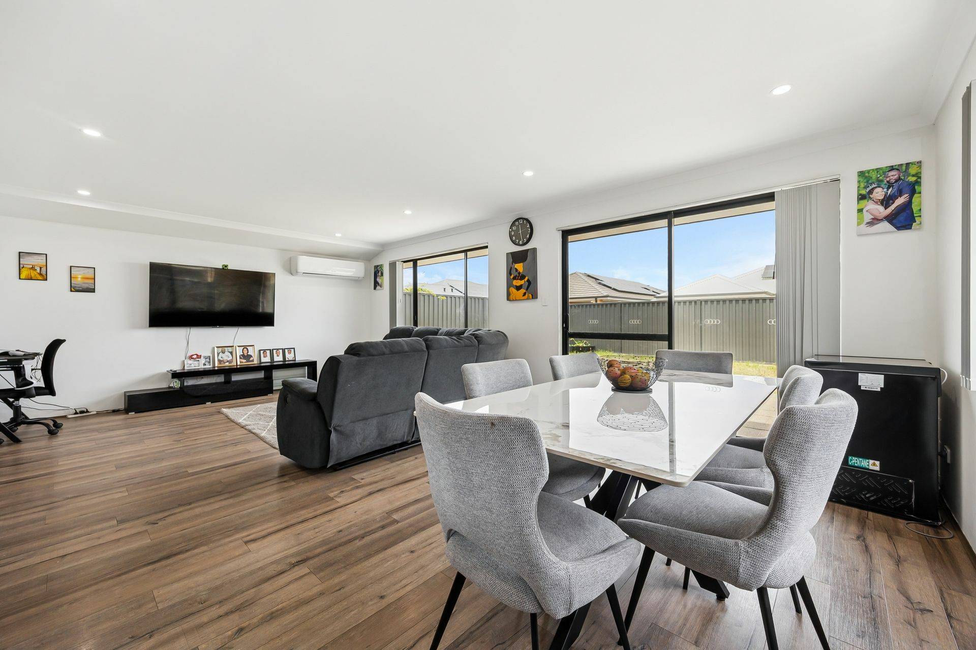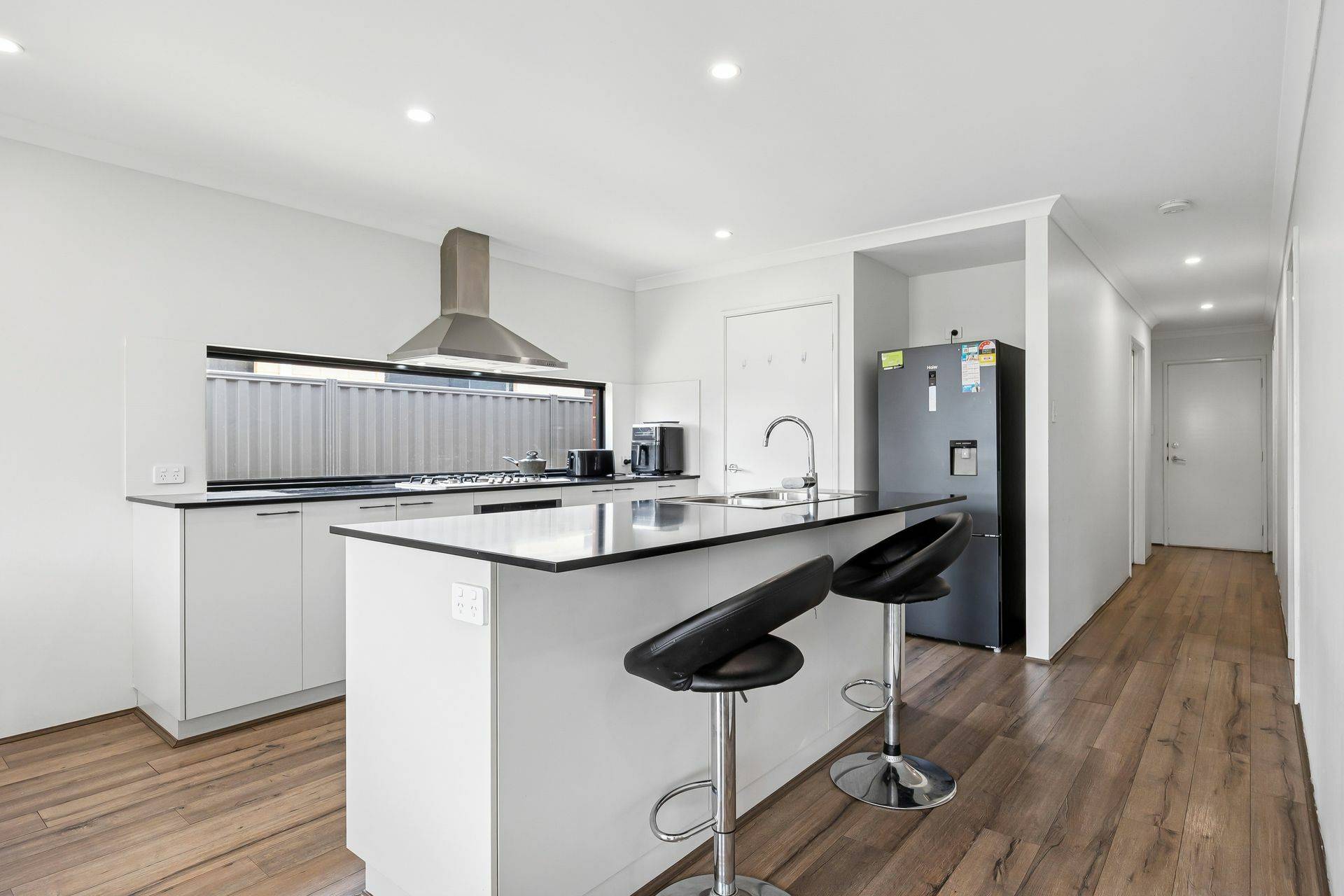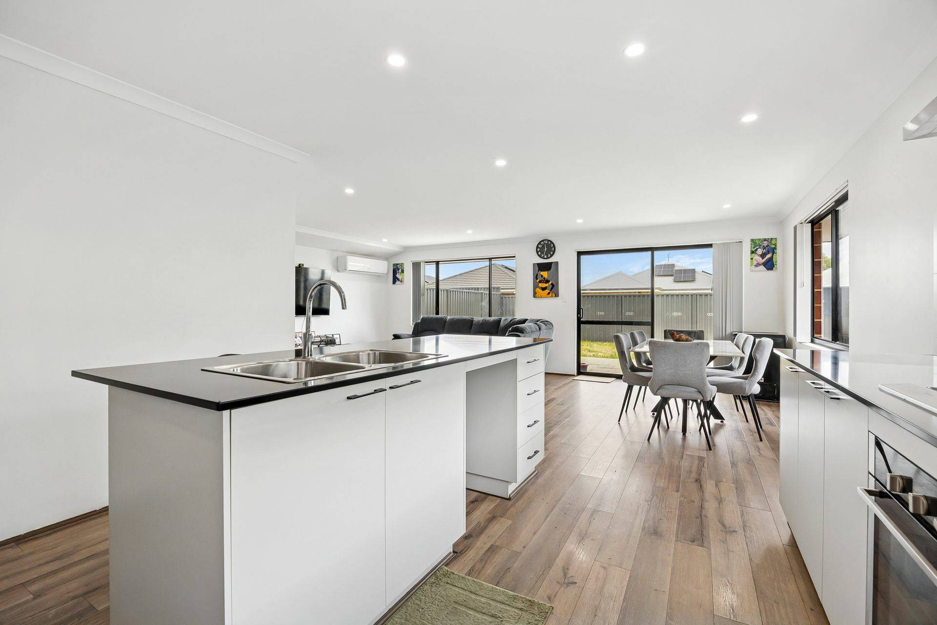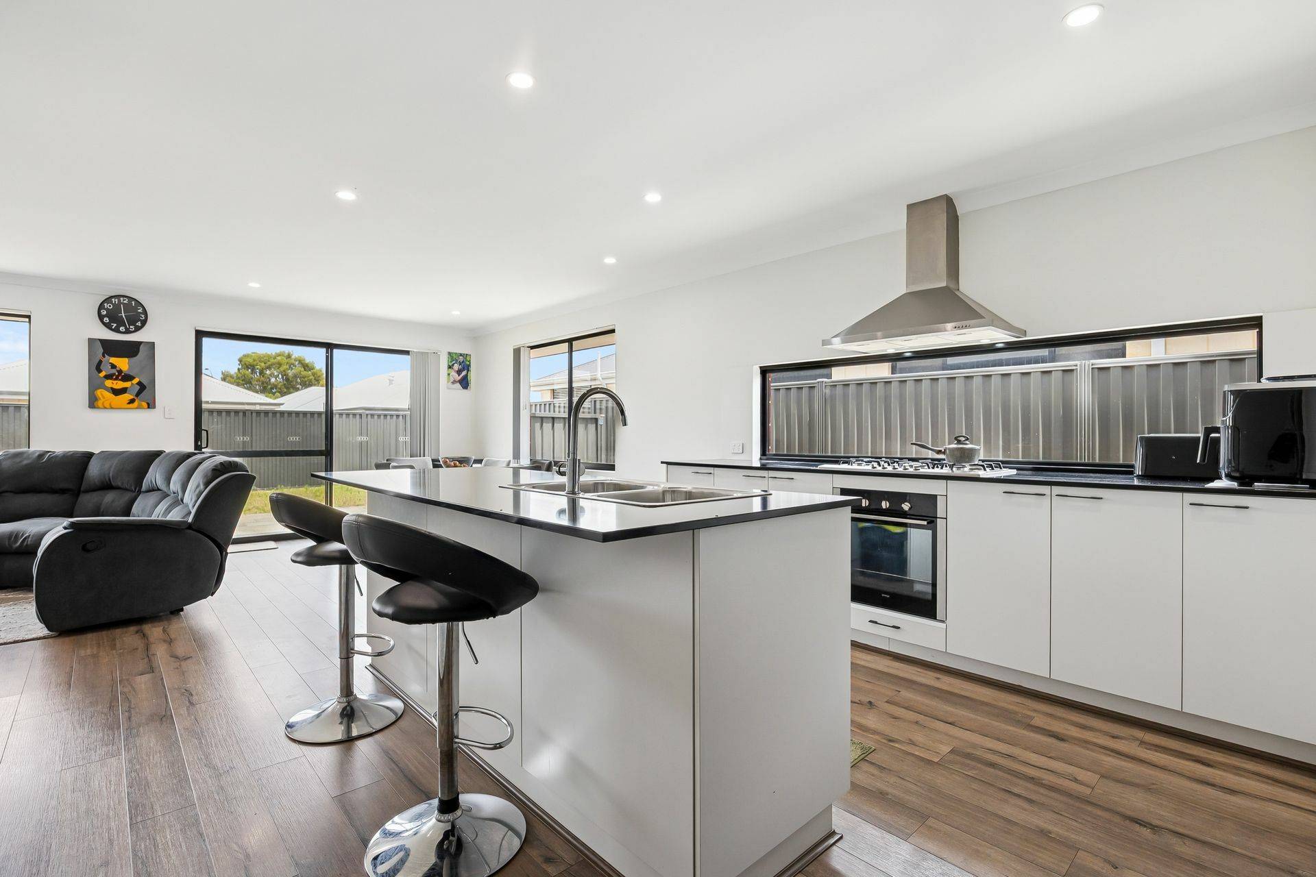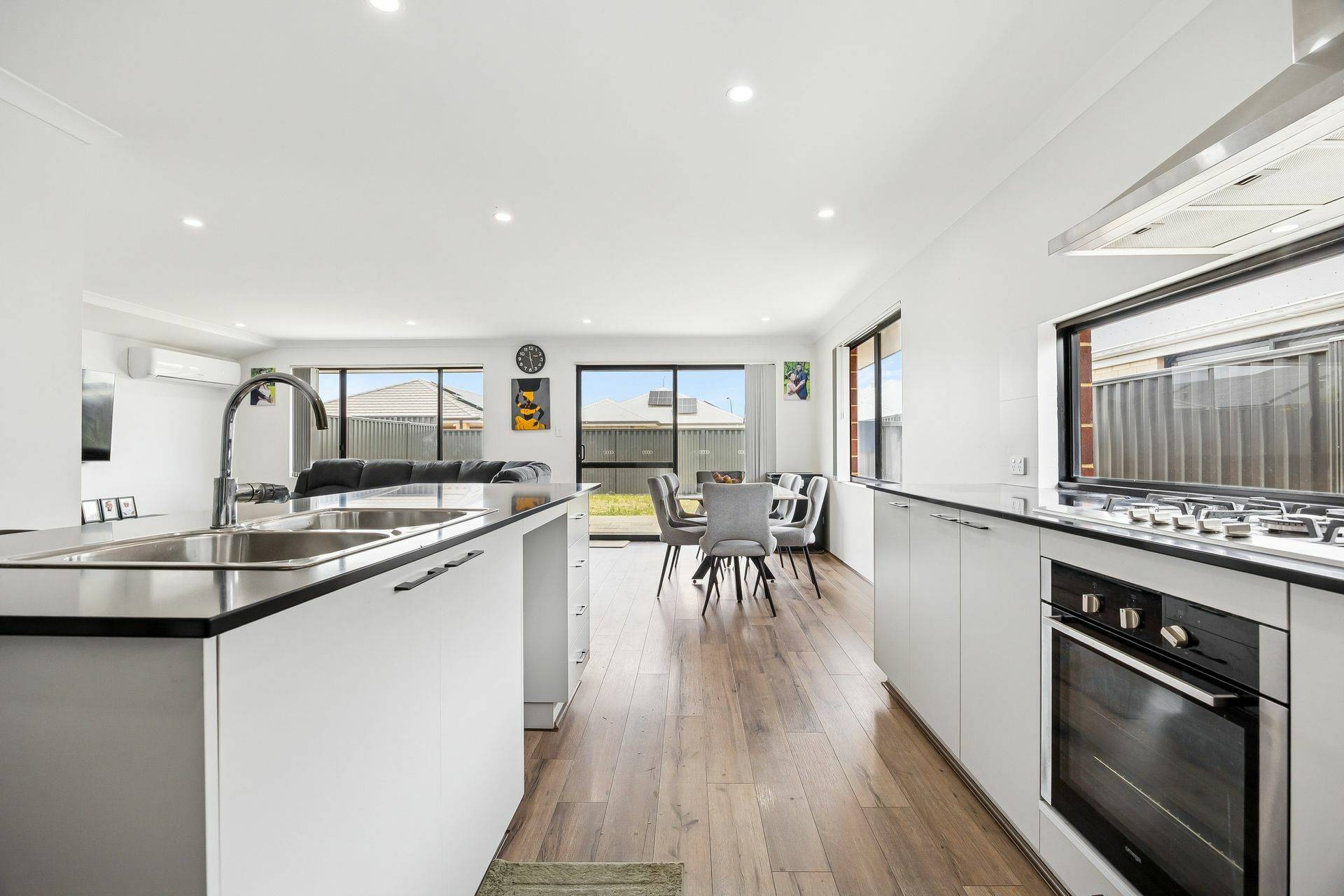 Tucked away in a quiet pocket of Hilbert on a well balanced 336sqm block, the home offers an easy, practical floorplan with generous open plan living and a stunning gallery kitchen that truly anchors the home with a feature splashback window that fills the space with natural light.