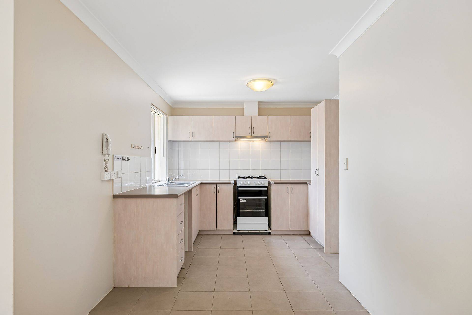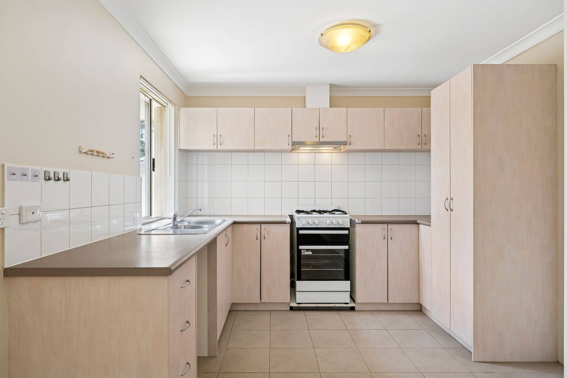 * Kitchen with ample cupboards, overhead storage, built-in pantry, dishwasher recess, fridge space, and generous preparation bench space