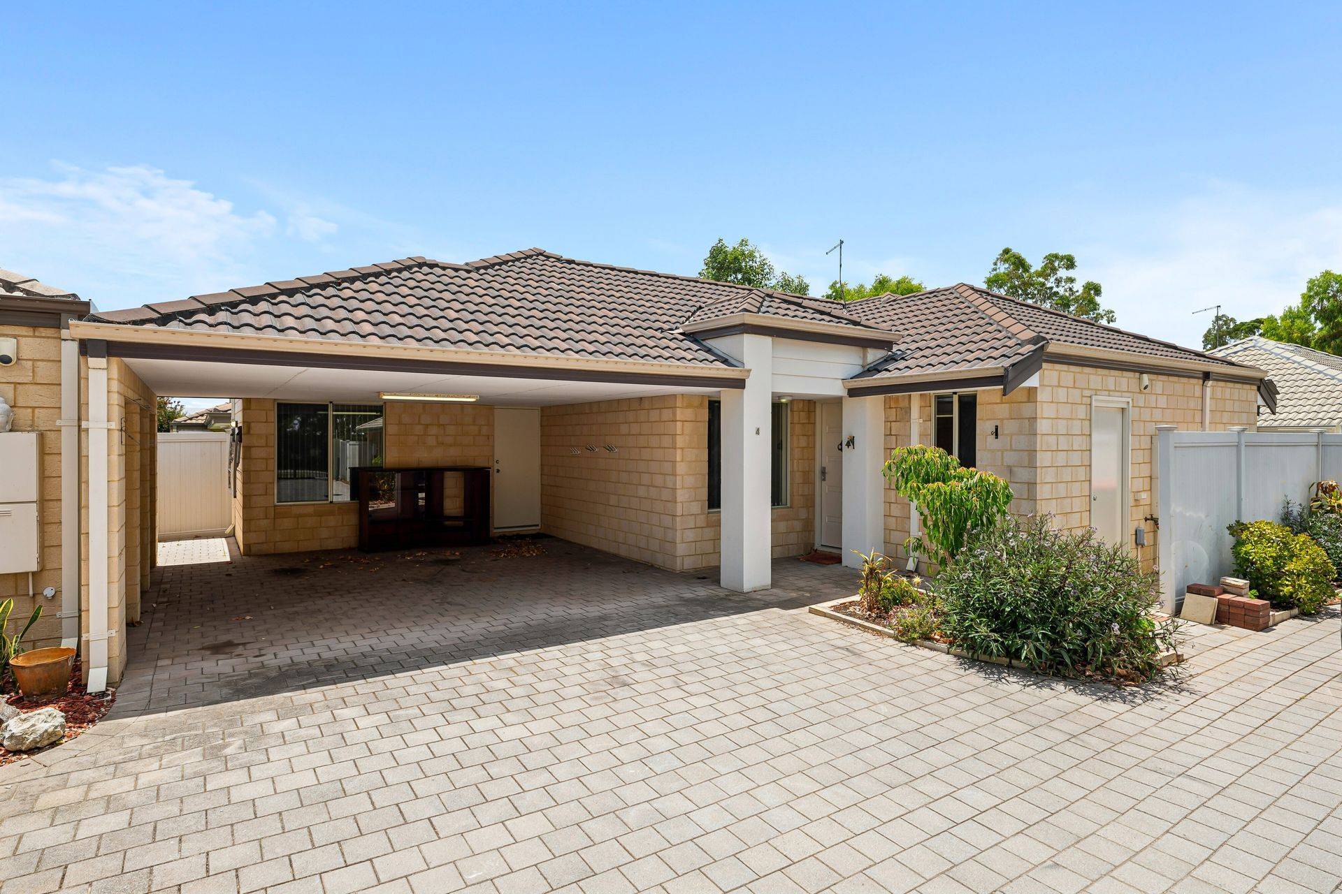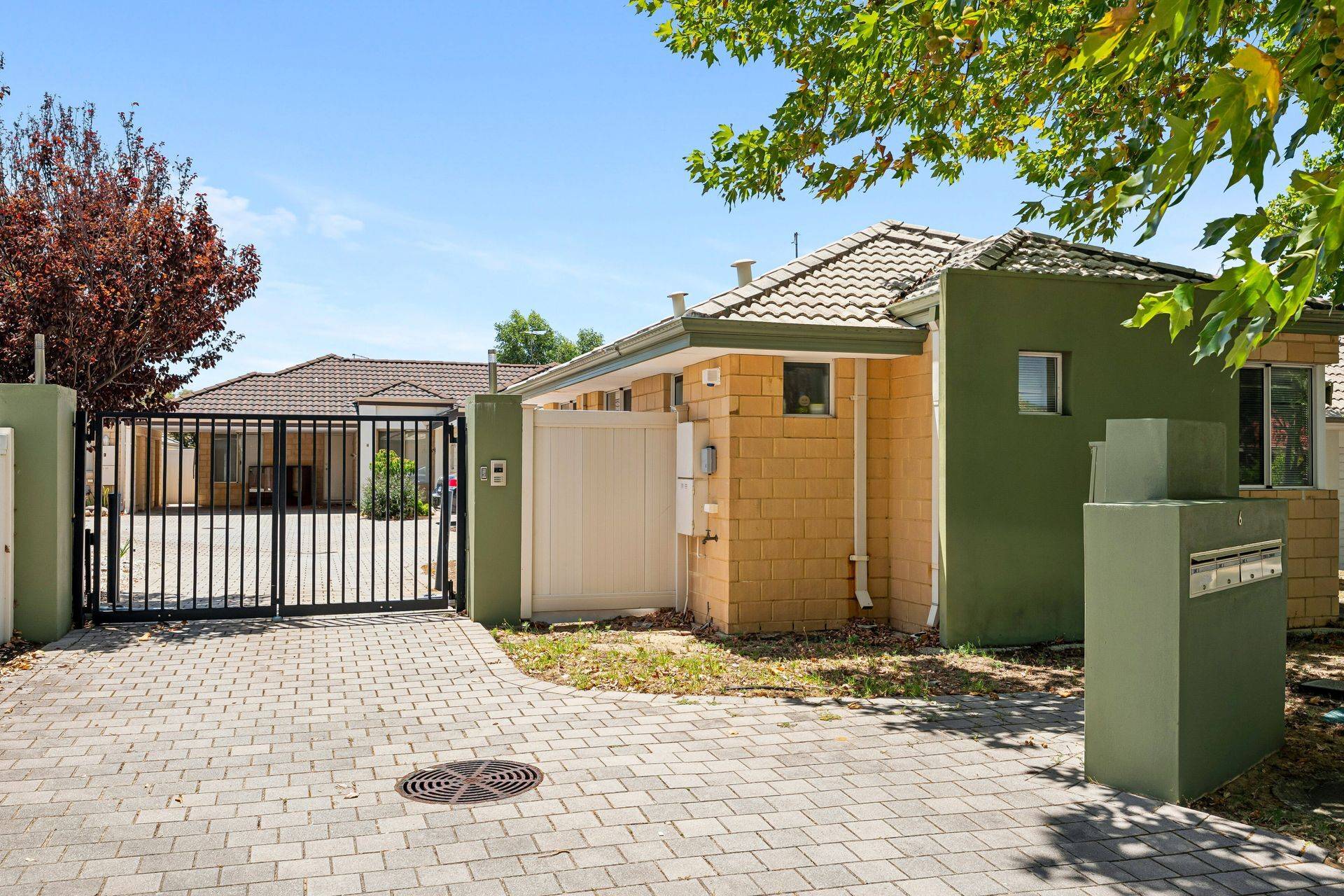 * Cream brick and tile facade with secure gated entry