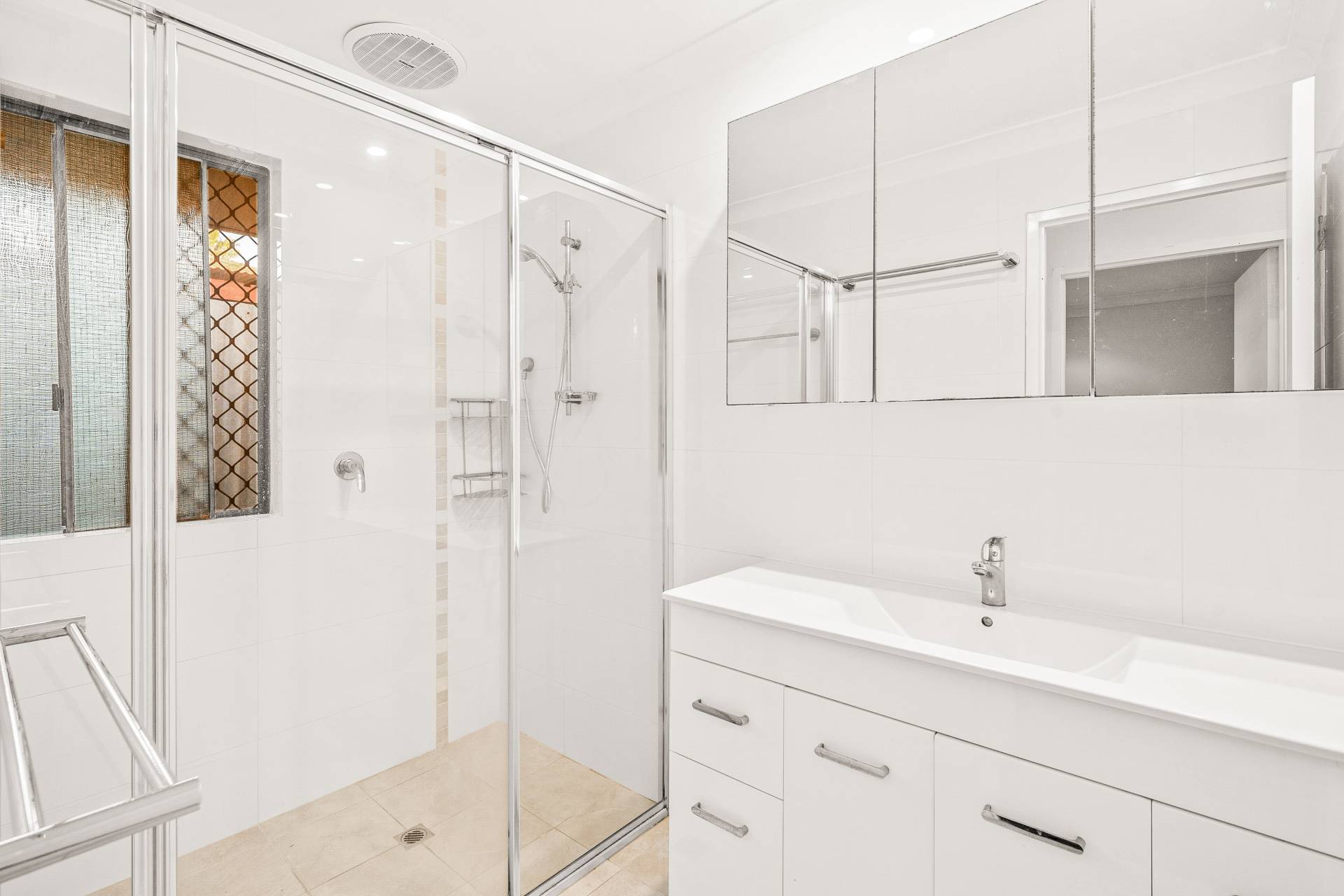 * Tastefully renovated bathroom, a sleek glass shower and modern vanity