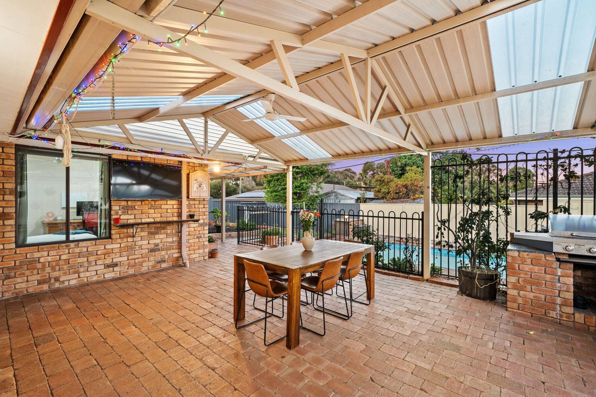 The heart of the home lies in the open plan kitchen and living area, seamlessly flowing out to the covered outdoor retreat. Picture yourself entertaining under the stars, with ample room for lavish BBQs overlooking the inviting below ground pool and a lawn area with shrubs in a raised bed creating an idyllic backdrop.